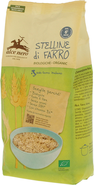 Alce Nero spelt stelline — small, star-shaped pasta — is made with Italian spelt. It features a distinctive sweet flavour and a long stem. Our stelline pasta is made exclusively with spelt flour and spring water from the Latemar massif in the Dolomites. What’s more, it contains added vitamin B1 yet no added flavourings