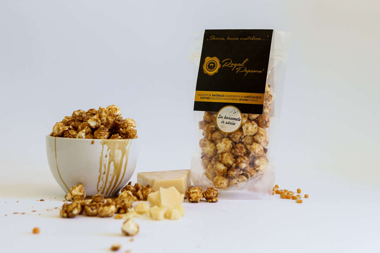 We would like to introduce you our product – handmade gourmet popcorn Royal Popcorn with Caramel and Cream Cheese. The exceptional taste of our product is made because of smooth caramel recipe and variety of flavours, created by using only natural ingredients, which are locked in at different stages of the cooking process, so that they would be released at different intervals as you eat. Corn kernels used in the production are GMO free. We use only coconut oil, which is one of the healthiest options available, for popping the corn. Because of these reasons we can surely say that our product matches high standards of quality and offers extraordinary taste experience.
